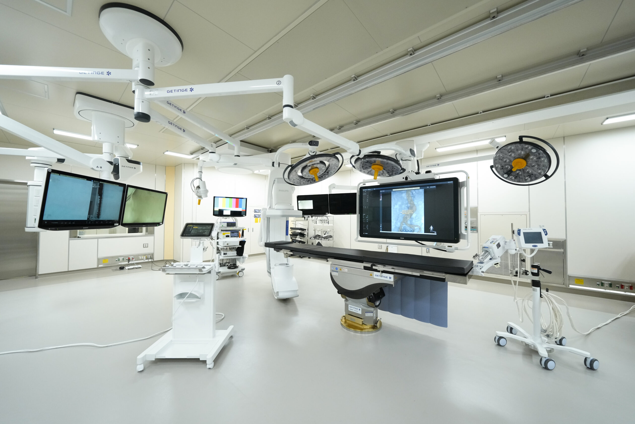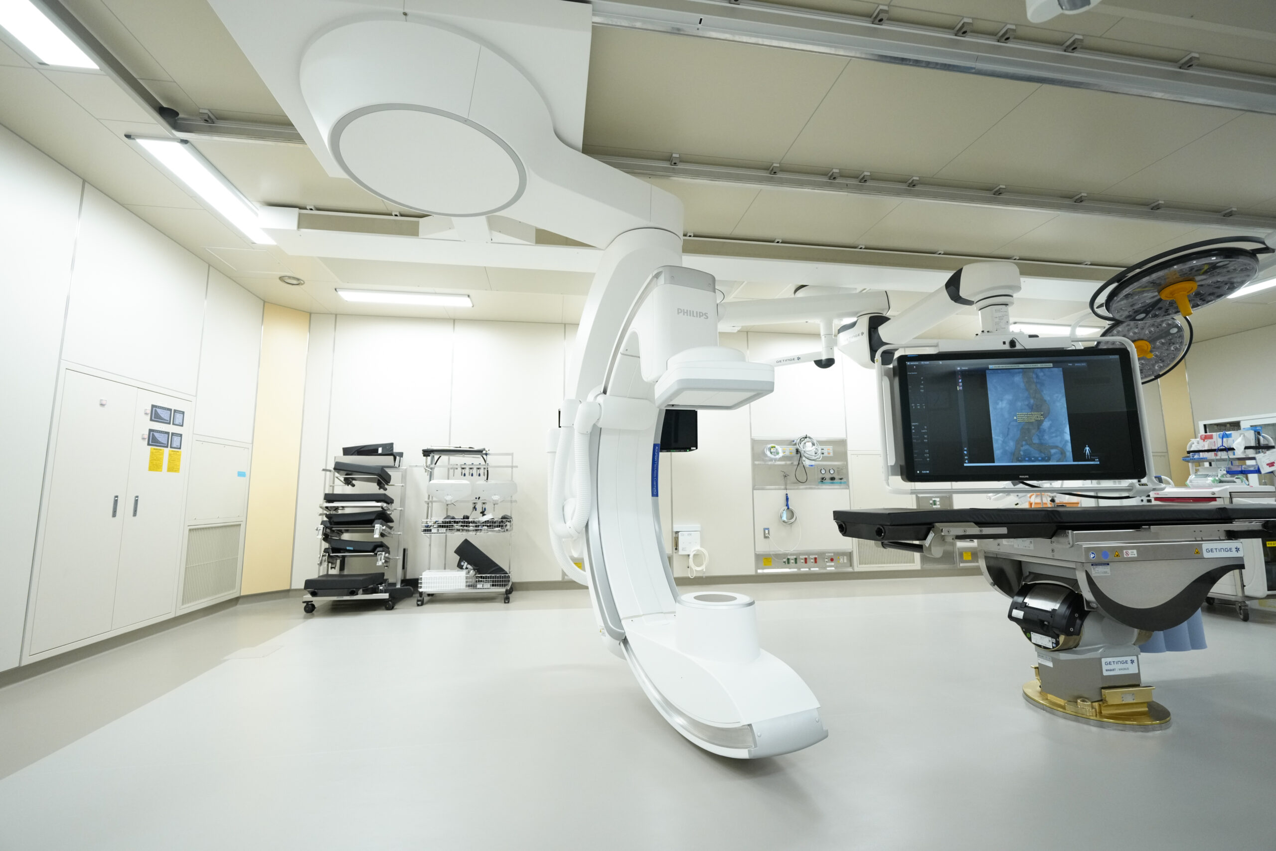 近年、急速に発展している低侵襲手術(内視鏡などを使用し患者さんに負担の少ない手術)をはじめ、多くの専門化が注目している多軸血管造影装置を導入したハイブリッド手術室が稼動しています。ハイブリッド手術室は、手術室に血管造影装置(高画質・3D)を組み合わせた手術室で、カテーテルを使う血管内治療と外科手術を同時に行うことができる画期的な手術室です。この手術室により、従来困難であった心臓や脳疾患へのアプローチが可能になりました。今後も、新技術と知識を取り入れ、安全で先進的な治療を提供して参りたいと考えております。