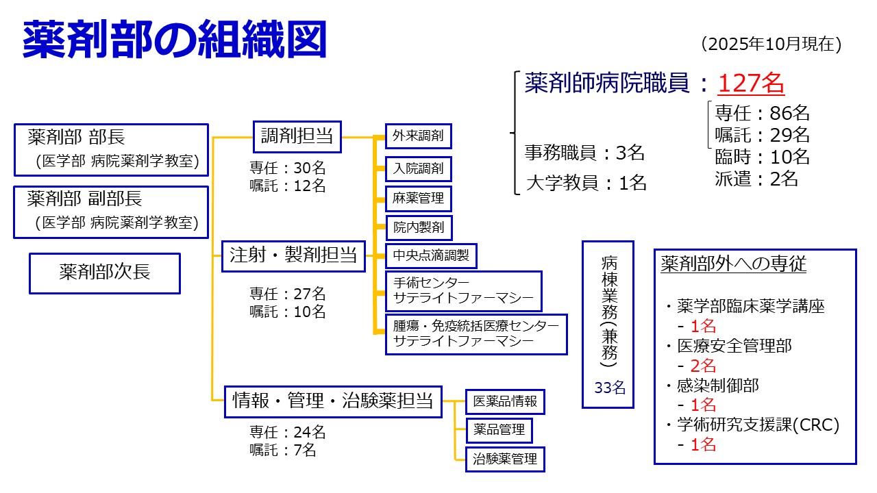 内容は、お薬の調剤、患者さんへのお薬の説明、医薬品情報の収集・評価と提供、医薬品管理、院内製剤、注射薬混合調製等多岐に渡っています。それぞれの業務は、患者さんを中心として医師や看護師など他の医療スタッフと連携しており、患者さんに信頼される質の高い安全で安心な医療を提供することを目指しています。