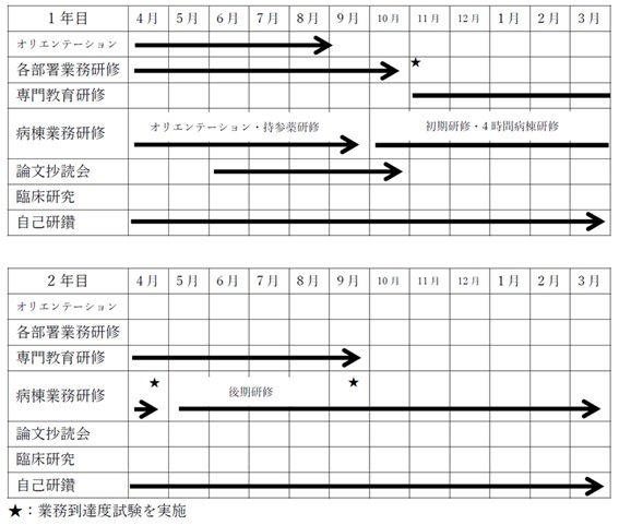 このレジデント研修は、厚生労働省より示されている「薬剤師臨床研修ガイドライン*」に準拠し、薬剤師の基本であるジェネラリストとしての知識・技術、チーム医療を実践するために必要な基本的臨床能力と薬剤師の専門性を身につけることに加えて、業務上の問題を発見して解決していくプロセスで必要な科学的思考・研究能力を身につけたPharmacist-Scientistを育成することを目指した、2年間の研修プログラムとなっています。